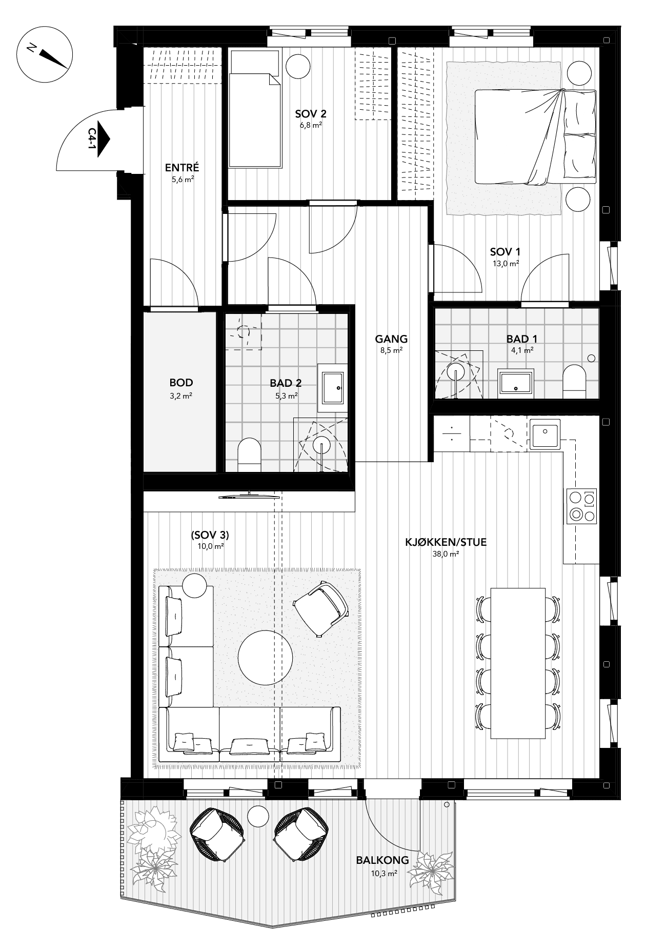 Stor 3-roms hjørneleilighet som med enkle grep kan bli en 4-roms. Stue / kjøkken med vinduer på to sider som sikrer godt med naturlig lysinnslipp. 2 bad, hvor det ene badet er tilknyttet hovedsoverommet. Romslig entré med egen bod i tilknytning. Privat terrasse på over 10 kvm med utsikt mot fjorden. Egen bod i kjeller.