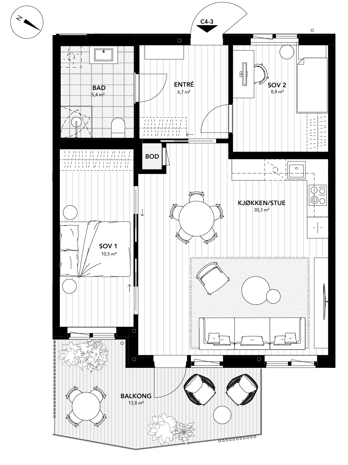 3-roms leilighet i 4 etasje med stor balkong (14 kvm) med utsikt mot fjorden. To romlige soverom. Luftig stue/kjøkken areal med gode møbleringsmuligheter. Egen bod i kjeller.