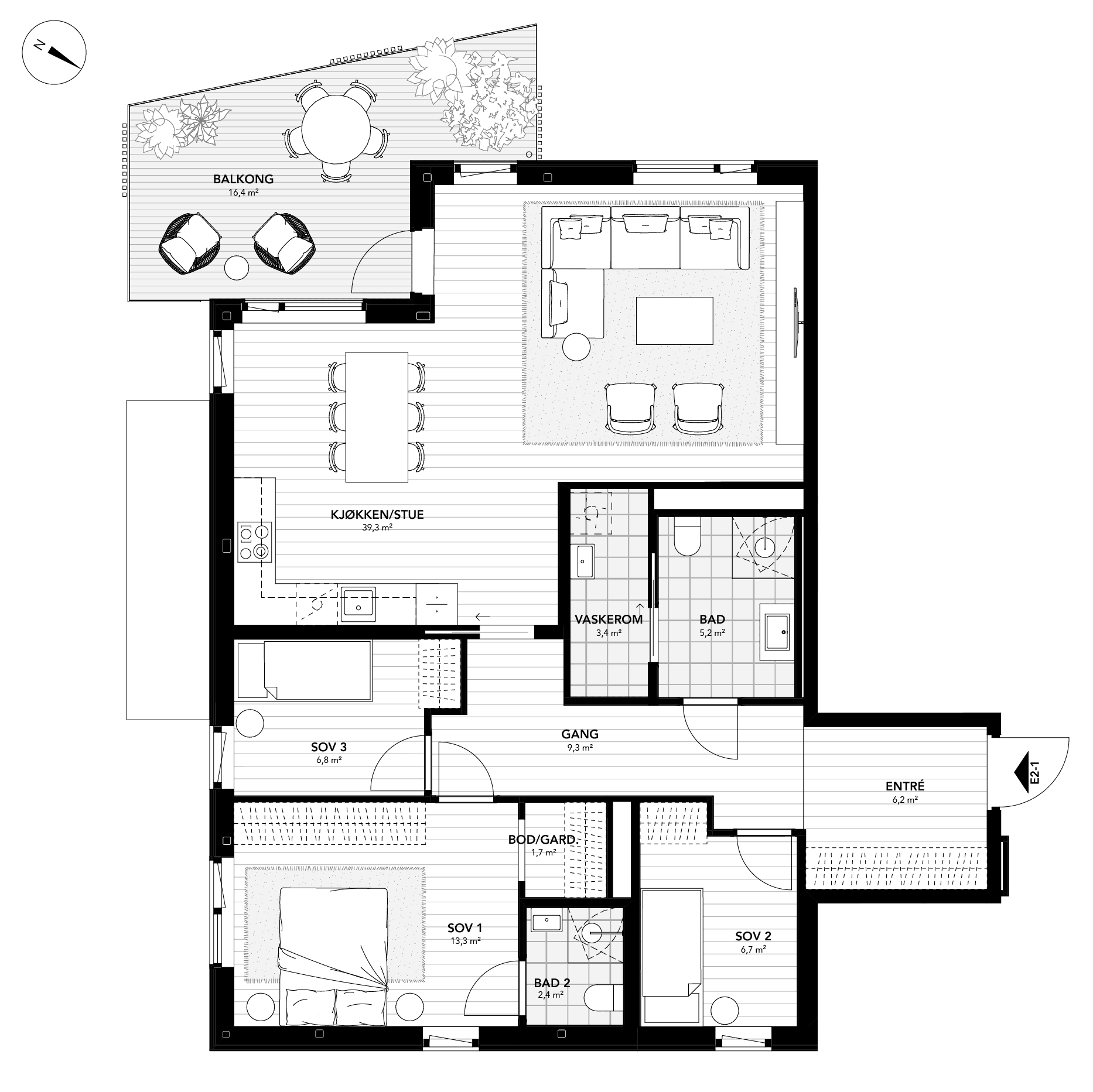 Stor 4-roms hjørneleilighet på 100 kvm med stor balkong (16,4 kvm) med flott fjordutsikt. Stue/kjøkken med vinduer på to sider som sikrer godt med naturlig lysinnslipp. 2 bad, hvor det ene badet er tilknyttet hovedsoverommet og det andre badet har direkte tilgang til vaskerom. Egen bod i kjeller.