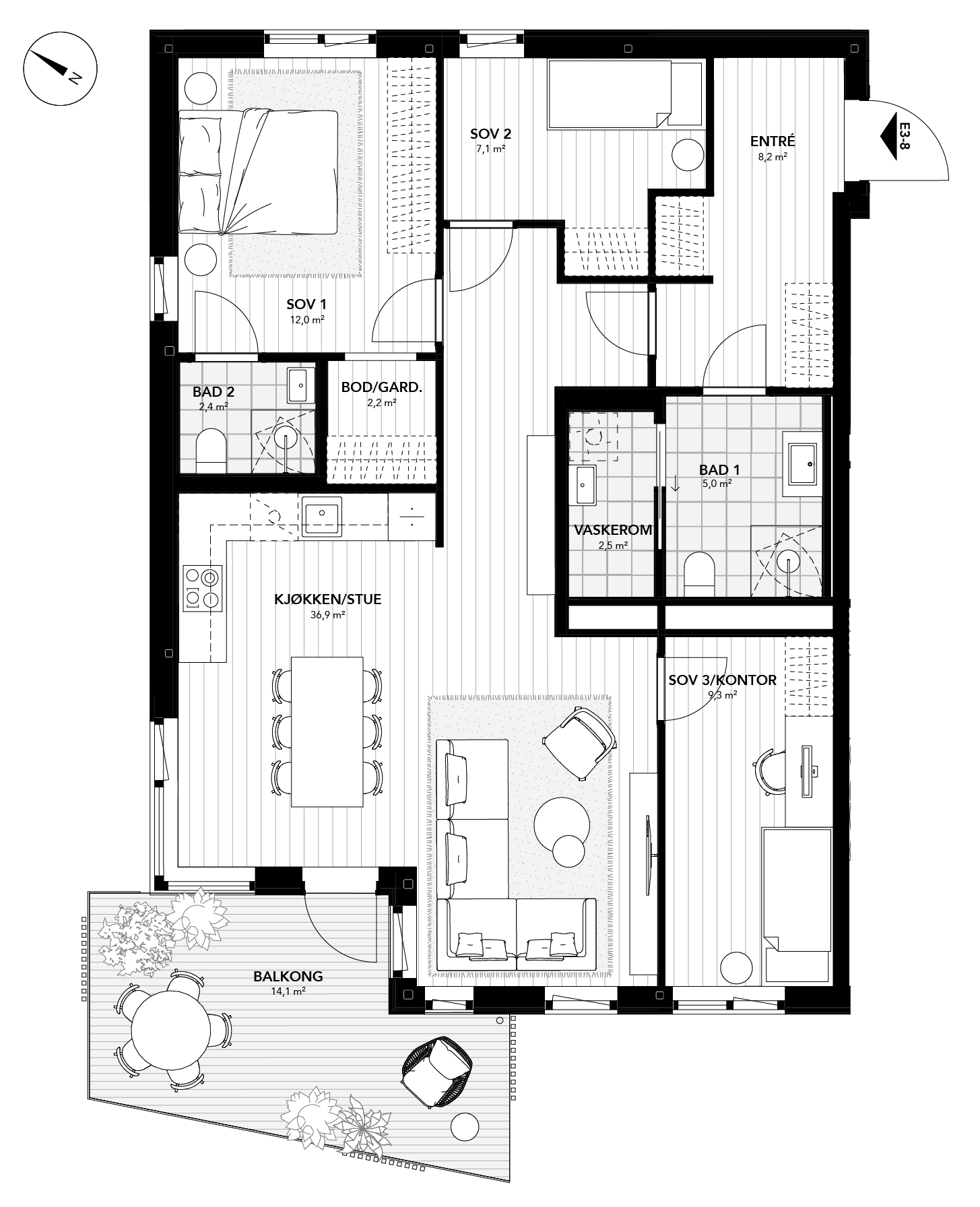 Innholdrik 4-roms hjørneleilighet med flott fjordutsikt fra privat balkong. 2 bad, hvor det ene badet er tilknyttet hovedsoverommet og det andre badet har direkte tilgang til vaskerom. Rmoslig stue/kjøkken med vinduer på to sider som sikrer godt med naturlig lysinnslipp. Innvendig bod / garderobe og egen bod i kjeller.