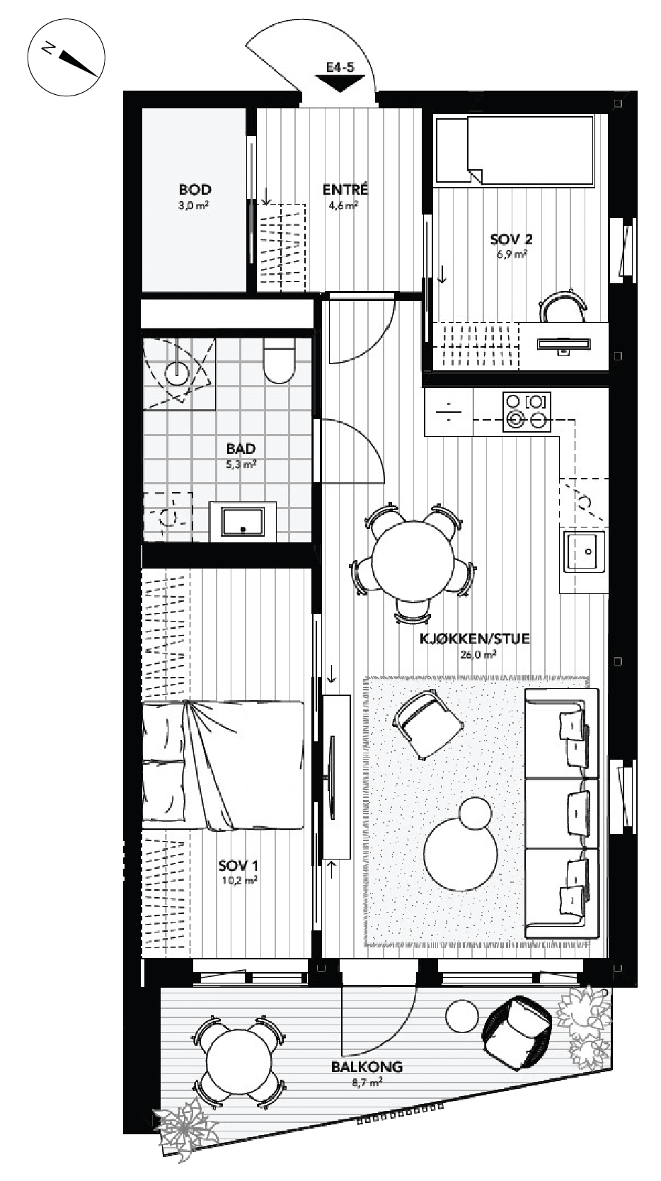 Stor og prisgunstig 3-roms hjørneleilighet med privat balkong mot sør, to soverom og innvendig bod. Stue / kjøkken med vinduer på to sider som sikrer godt med naturlig lysinnslipp. Egen bod i kjeller.